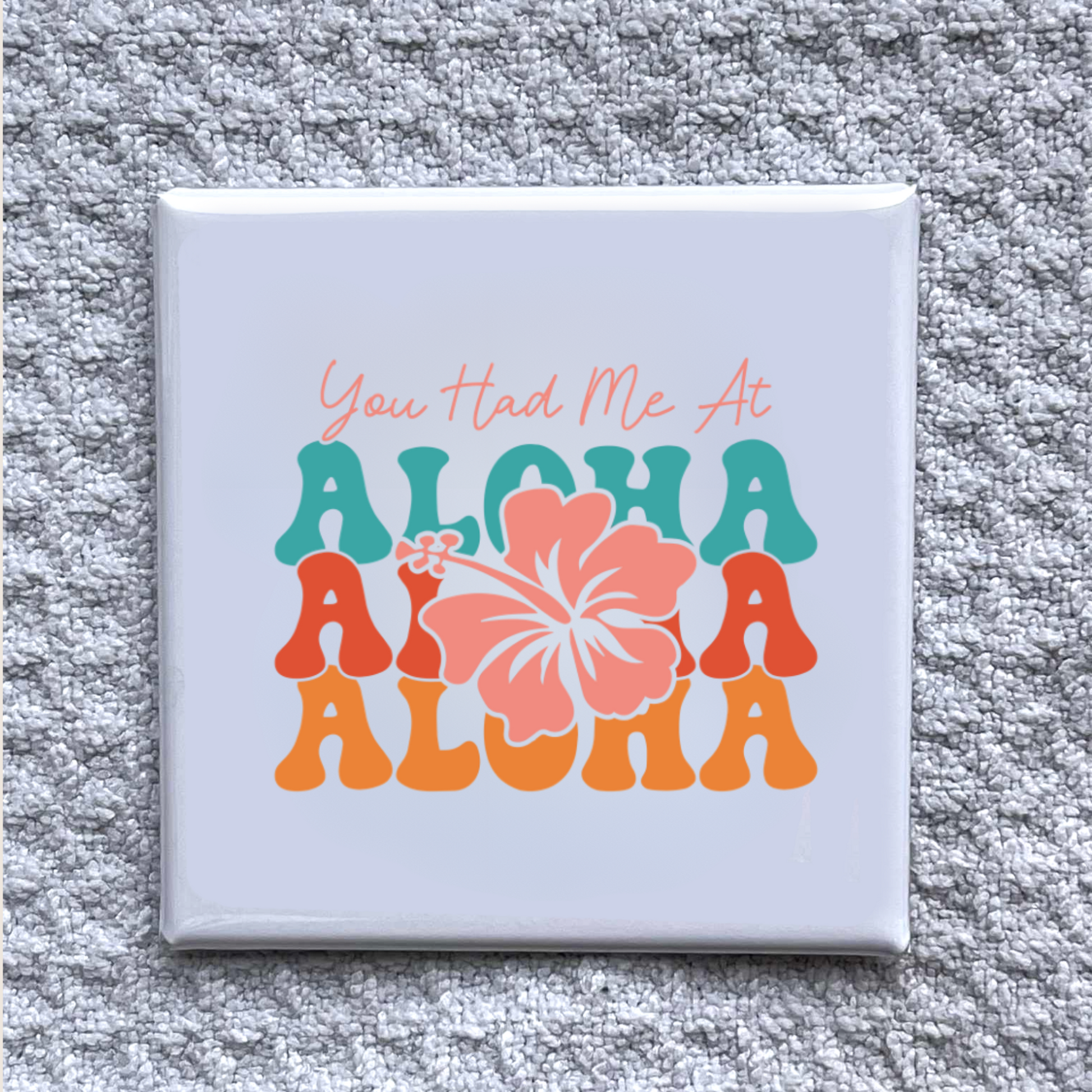 Bring island vibes into your everyday life with this colorful magnet featuring the phrase “You had me at Aloha” paired with a bold hibiscus flower and retro lettering. The bright teal, coral, and orange tones give it that perfect tropical feel.